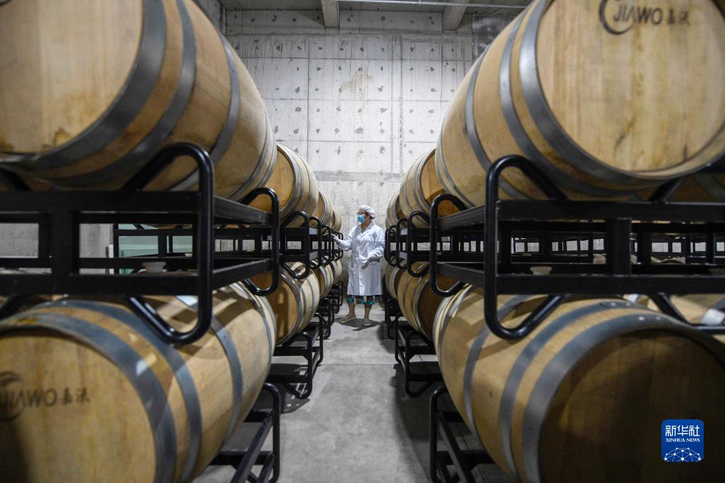 8月22日,在承德縣一家蘋果酒生産企業,工人在存儲車間查看酒桶密封情況。
