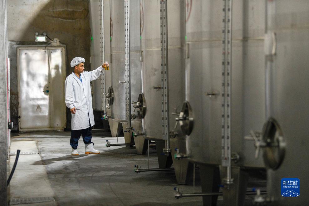 8月22日,在承德縣一家蘋果酒生産企業,技術人員在熟化車間查看蘋果酒品質。