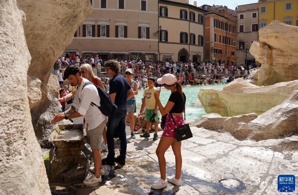 8月22日,人們在意大利羅馬許願池附近的一處水龍頭接水。