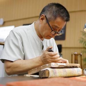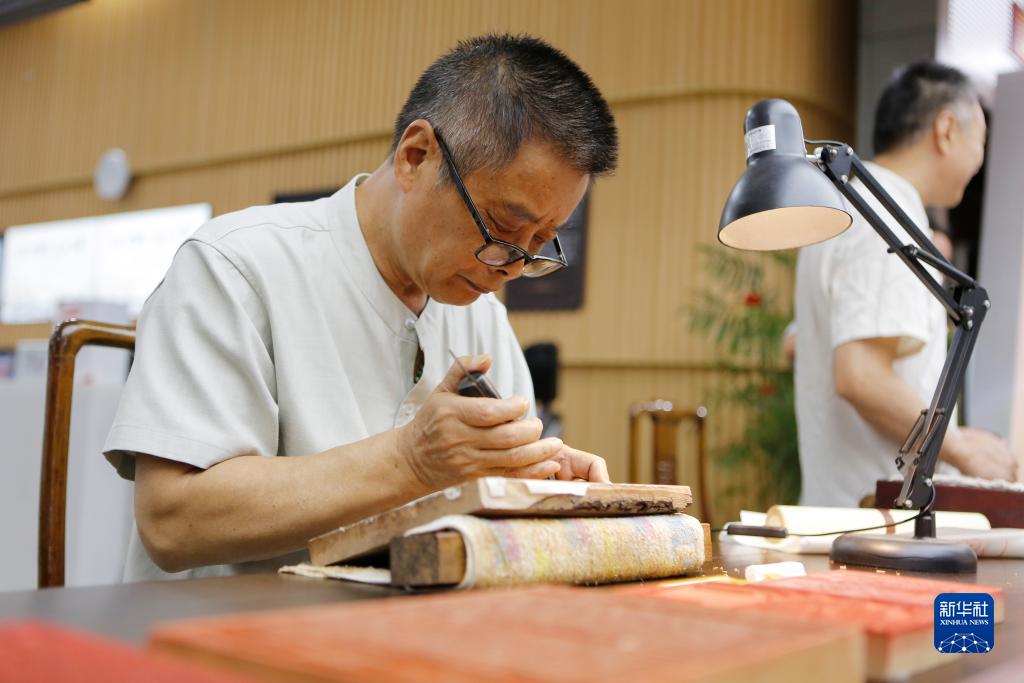 8月22日,在揚州市圖書館,江蘇省雕版工藝美術大師沈樹華在“古籍裏的揚州運河文化”市集上為市民展示雕刻技藝。