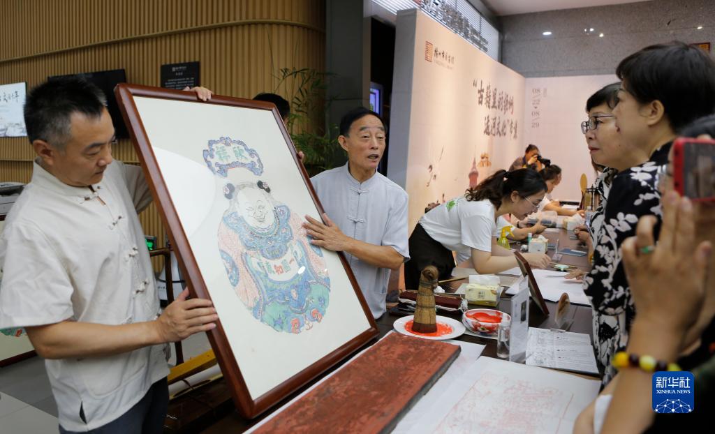 8月22日,在揚州市圖書館,雕版印刷技藝代表性傳承人李江民在“古籍裏的揚州運河文化”市集上為市民展示雕版印刷品。