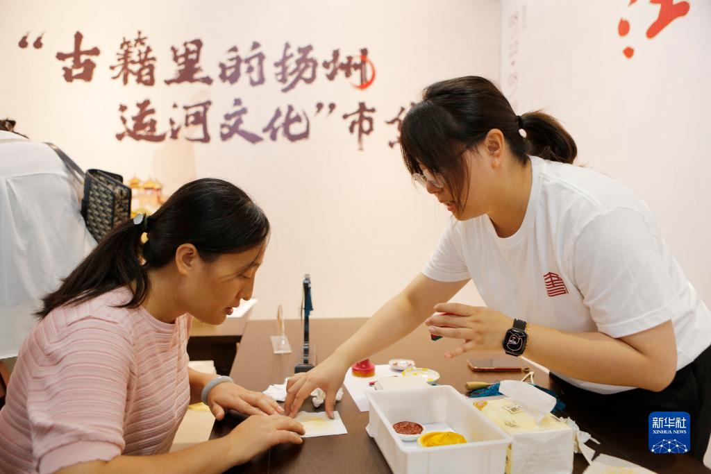 8月22日,市民在揚州市圖書館“古籍裏的揚州運河文化”市集參觀、體驗。