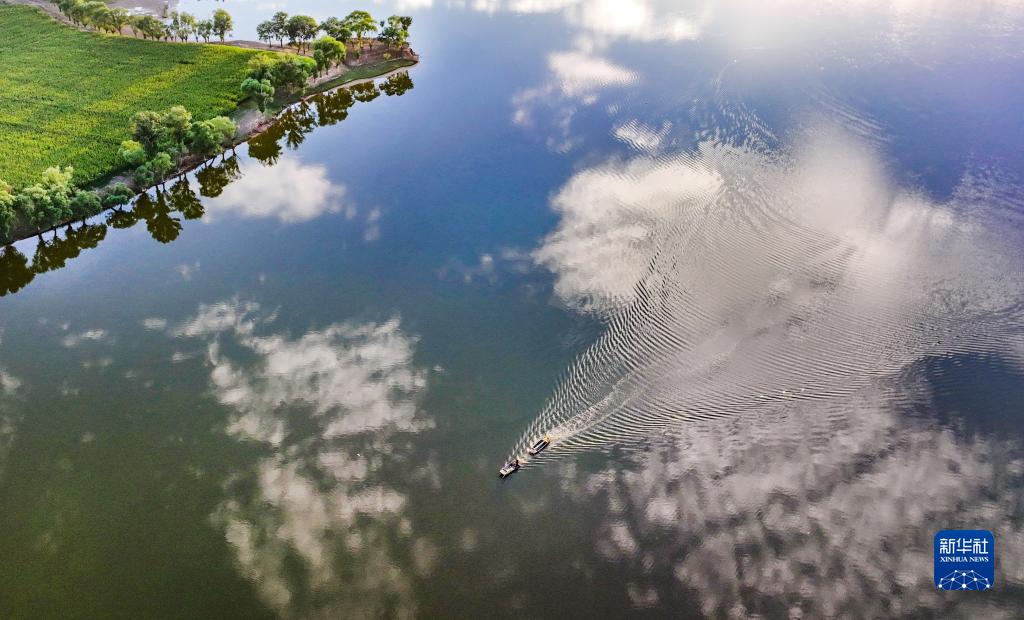 兩條小船行駛在蘆河河面上,宛如一幅壯麗的圖畫(8月18日攝,無人機照片)。