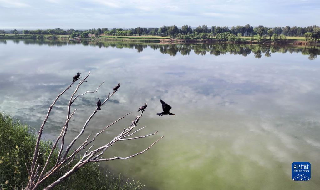 幾隻鸕鶿在蘆河岸邊的樹梢上歇息(8月19日攝,無人機照片)。