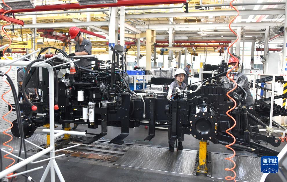 8月22日,在位於山東省濰坊市坊子區的濰柴雷沃智慧農業科技股份有限公司,工人在車間組裝生産農機設備。