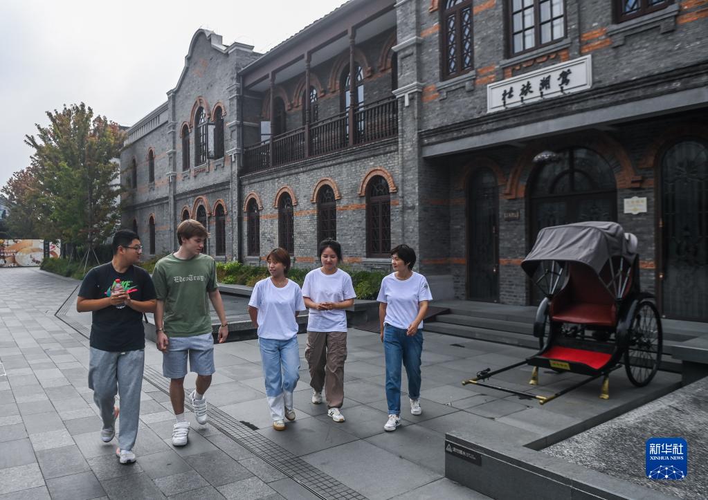8月23日,在嘉興南湖邊,一名外教(左二)帶着參加培訓的導游們模擬外國游客游覽過程中各種場景。