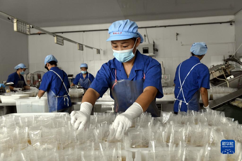 8月22日,在山東省濱州市沾化區馮家鎮隆旺水産的加工車間內,工人們對海蜇進行標準稱重。
