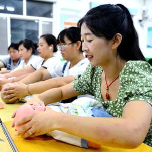 8月22日,老師(左二)在育嬰員培訓班上為學員們講解撫觸嬰兒的手法。