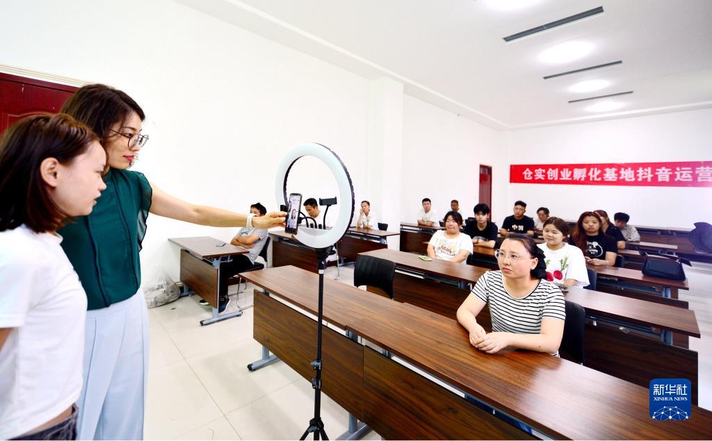 8月23日,學員(左一)在電商直播培訓班上學習直播技巧。
