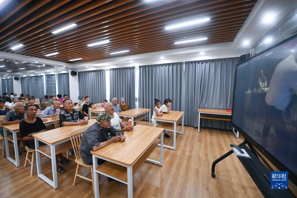 8月23日,在湖州市吳興區東林鎮東華村居家養老服務中心的影音室,老人們在觀看影片。