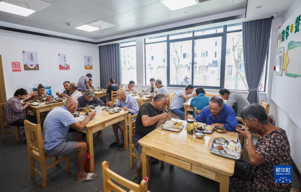 8月23日,在湖州市吳興區東林鎮東華村居家養老服務中心,老人們在老年食堂就餐。