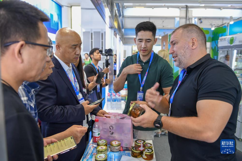 8月23日,在第十四屆中國—東北亞博覽會東北亞商品館,俄羅斯參展商向參觀者介紹商品。