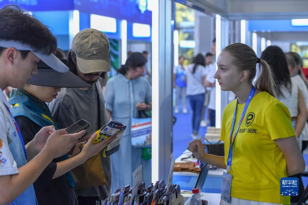 8月23日,在第十四屆中國—東北亞博覽會東北亞商品館,俄羅斯參展商向參觀者介紹商品。