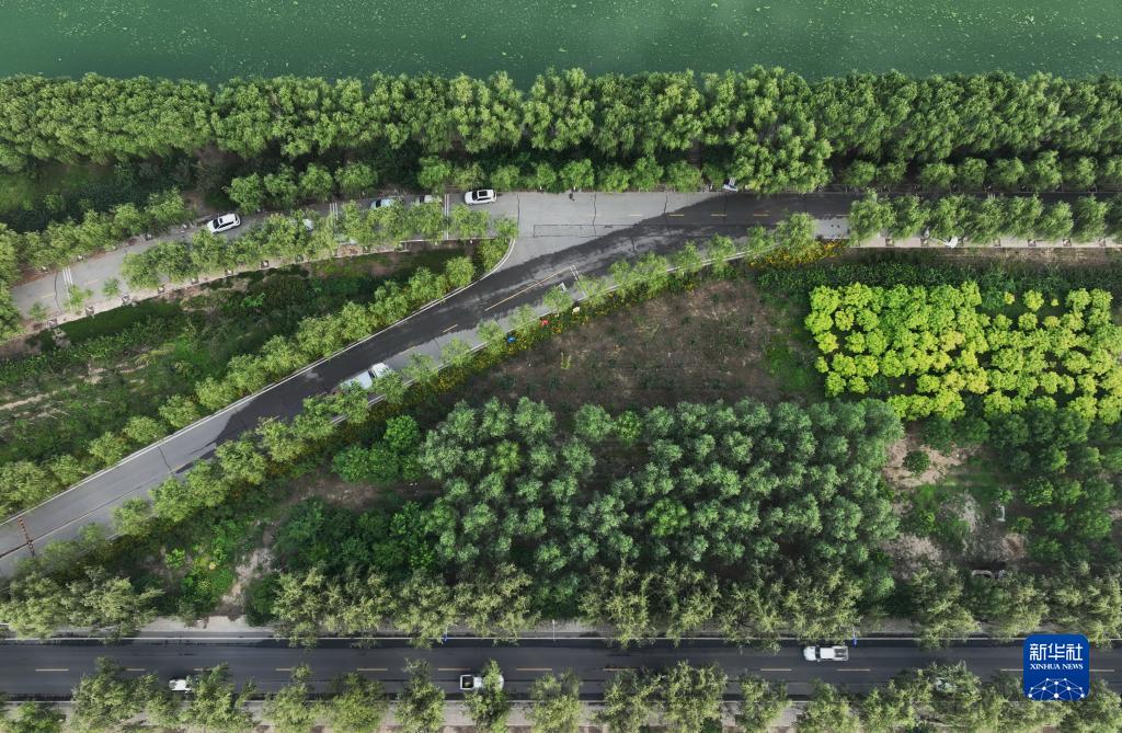 8月22日拍攝的唐山市豐南區城區通往南孫莊鎮的唐津運河景觀路(無人機照片)。