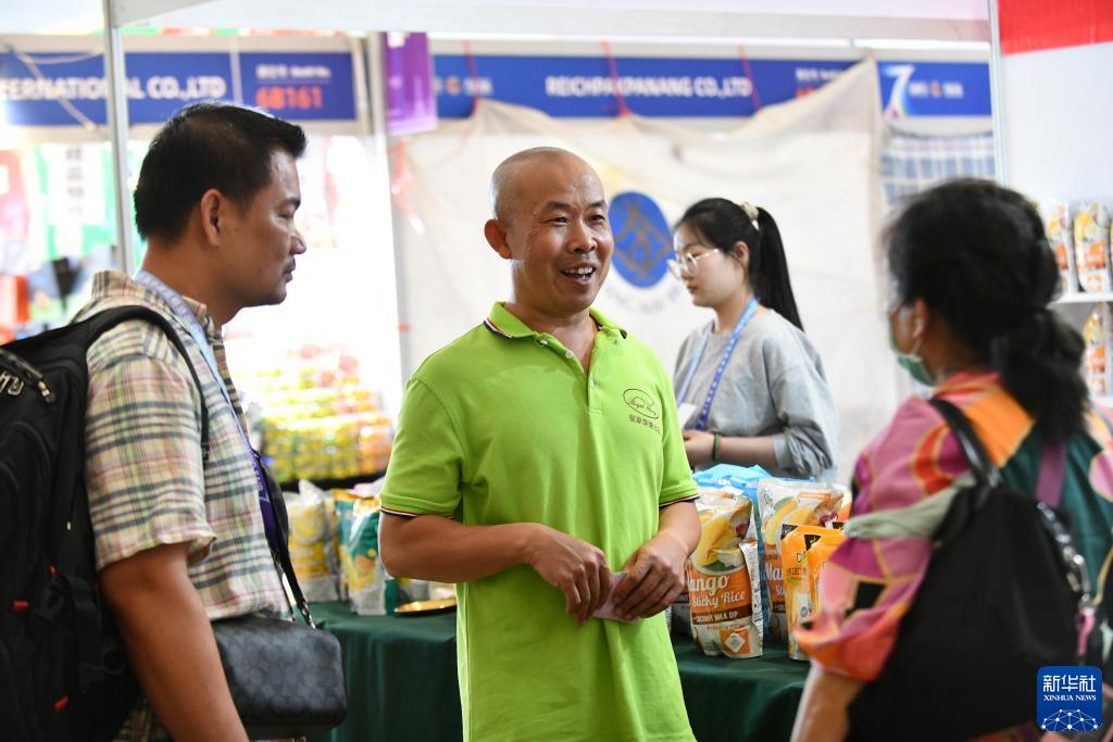 陳傑(中)在南博會現場和別的展商交流(8月18日攝)。新華社記者 陳欣波 攝