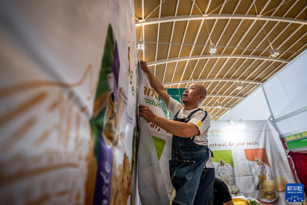 8月14日,泰國華商陳傑在南博會開幕前佈置展區。新華社記者 胡超 攝