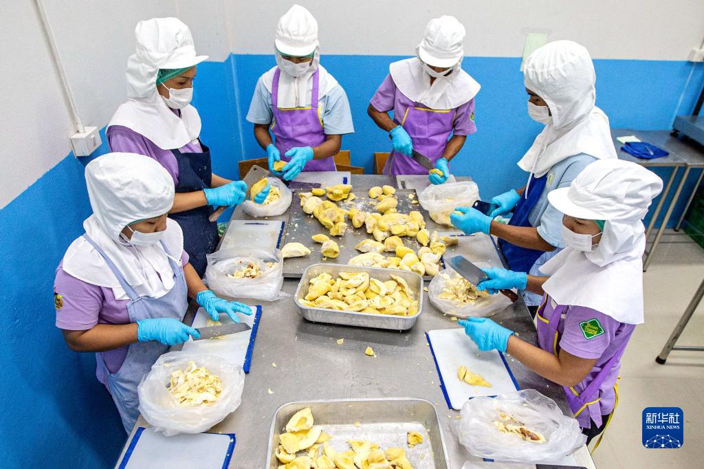 8月17日,在泰國尖竹汶府,尖竹汶果品公司工作人員切割榴蓮果肉。新華社記者 王騰 攝