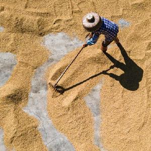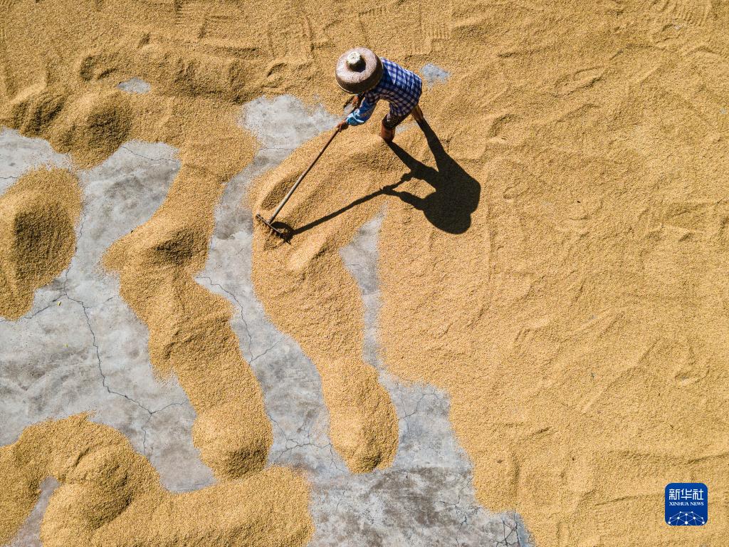 8月23日,海南省琼海市潭門鎮福田村的農民在晾曬稻穀(無人機照片)。