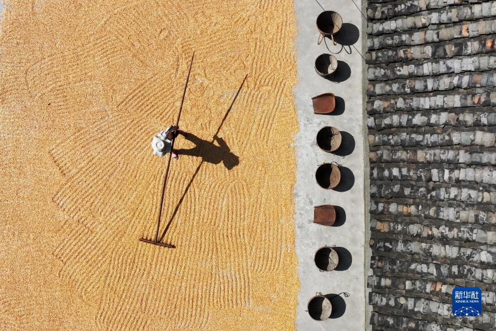 8月23日,重慶市黔江區沙壩鎮三台村村民在晾曬玉米(無人機照片)。