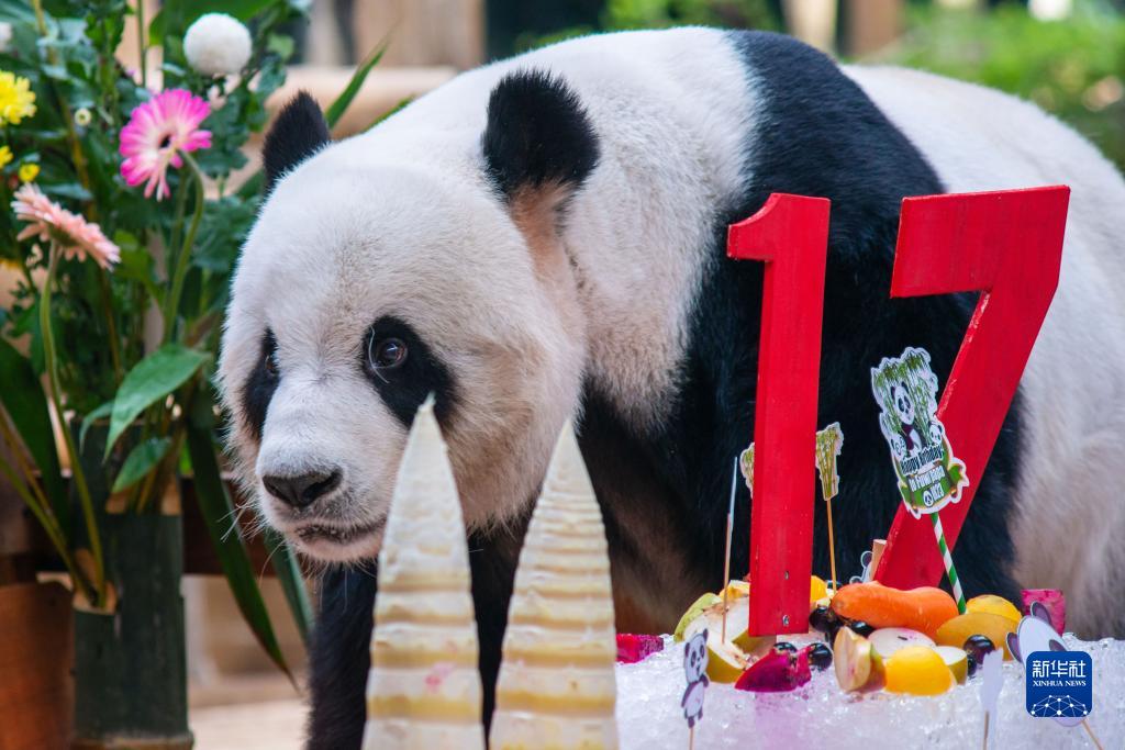 在馬來西亞國家動物園大熊貓保護中心內,中國旅馬大熊貓夫婦“興興”和“靚靚”23日迎來了17歲生日。