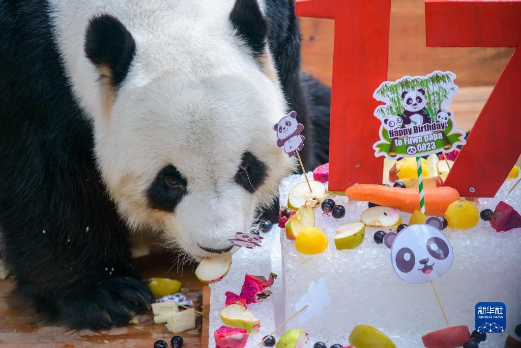 在馬來西亞國家動物園大熊貓保護中心內,中國旅馬大熊貓夫婦“興興”和“靚靚”23日迎來了17歲生日。