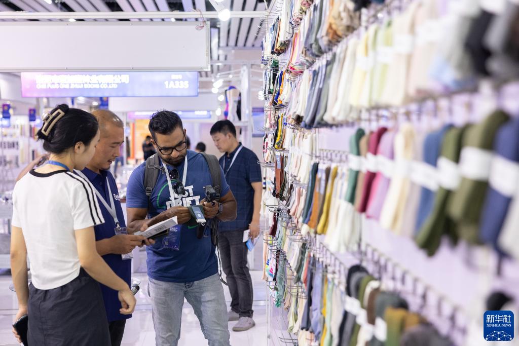8月23日,外商在襪子展位了解信息。
