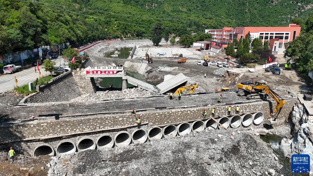 8月23日,在北京市房山區霞雲嶺中心小學,北京建工機施集團的施工人員在搶建供學校與外界通行的新橋梁(無人機照片)。