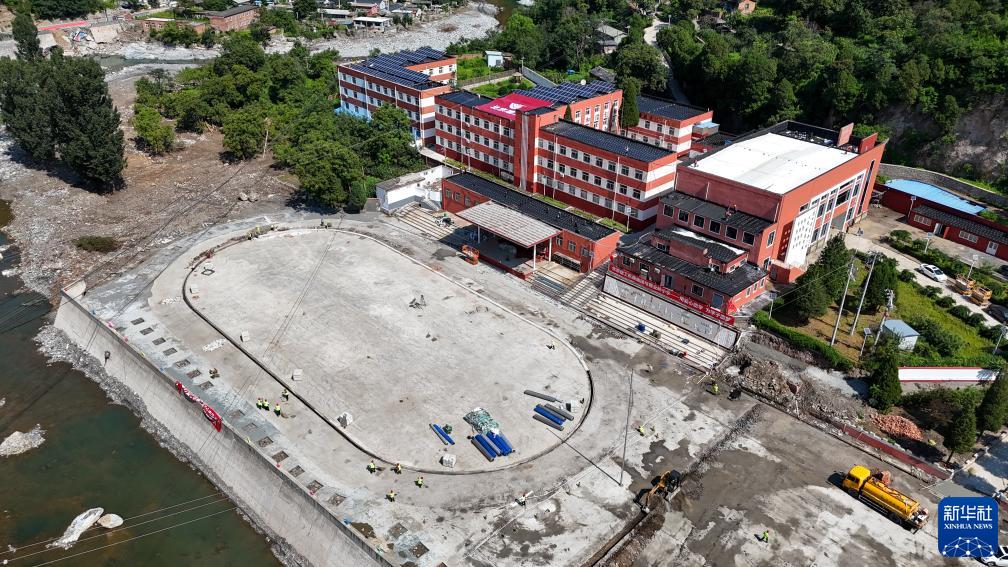 8月23日,在北京市房山區霞雲嶺中心小學,北京建工機施集團的施工人員在進行操場施工(無人機照片)。