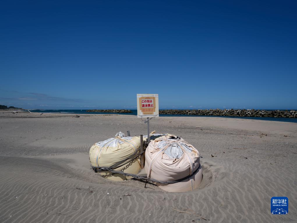 這是8月22日在日本福島縣相馬郡新地町釣師浜海水浴場拍攝的“禁止游泳”的告示牌。新華社記者 張笑宇 攝