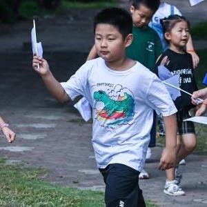 8月24日,在湖州市龍泉街道白魚潭社區新時代文明實踐站,黨員志願者教孩子們製作手工火炬。製作完成後,孩子們共同參與趣味火炬傳遞活動。