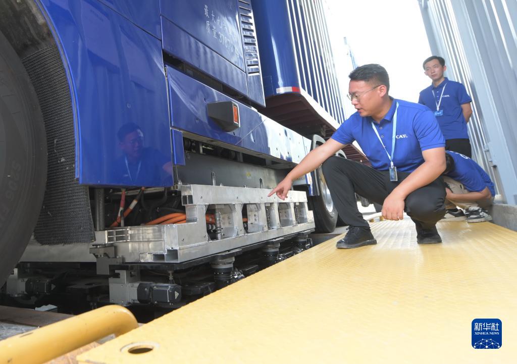 8月24日,工作人員在“騏驥·重卡換電站”內介紹重卡底盤自動換電流程。