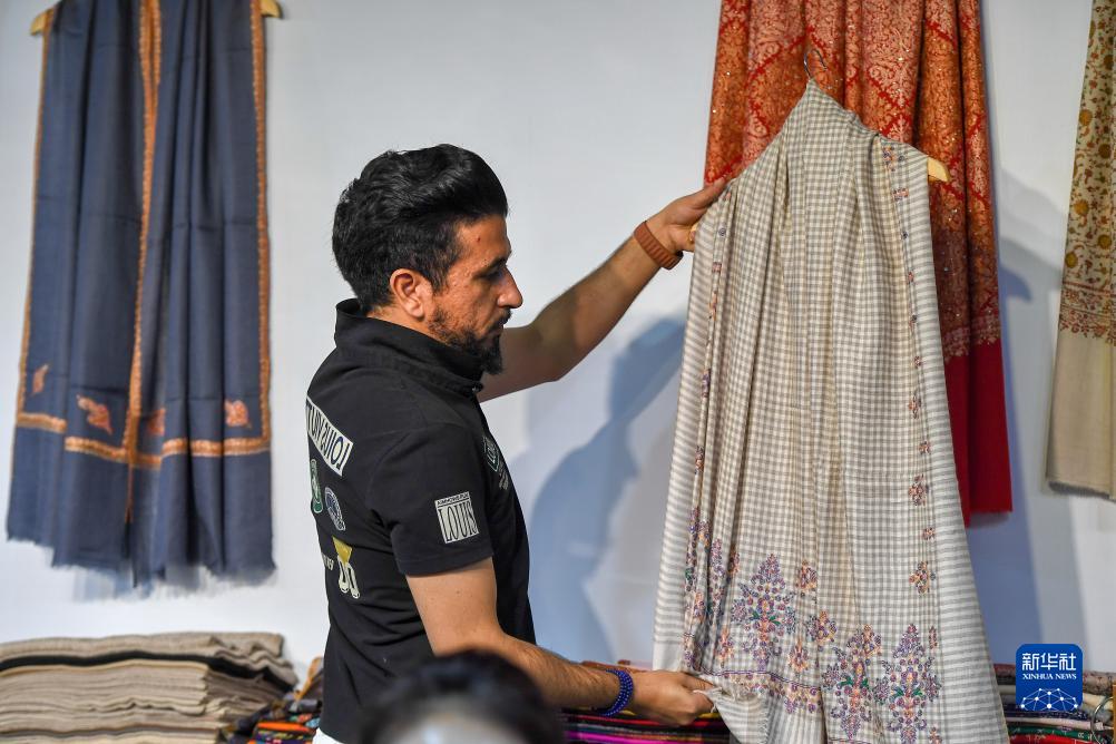 8月23日,在第十四屆中國—東北亞博覽會國際商品館,伊朗參展商懸挂紡織品。