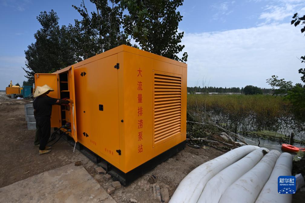 8月24日,工作人員在天津市靜海區大清河南堤抽水現場檢查抽水泵工作狀態。