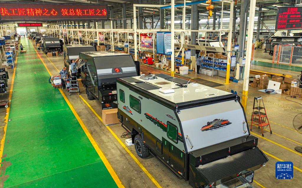 8月24日,山東省榮成市一家房車製造企業的工人在生産線上忙碌(無人機照片)。
