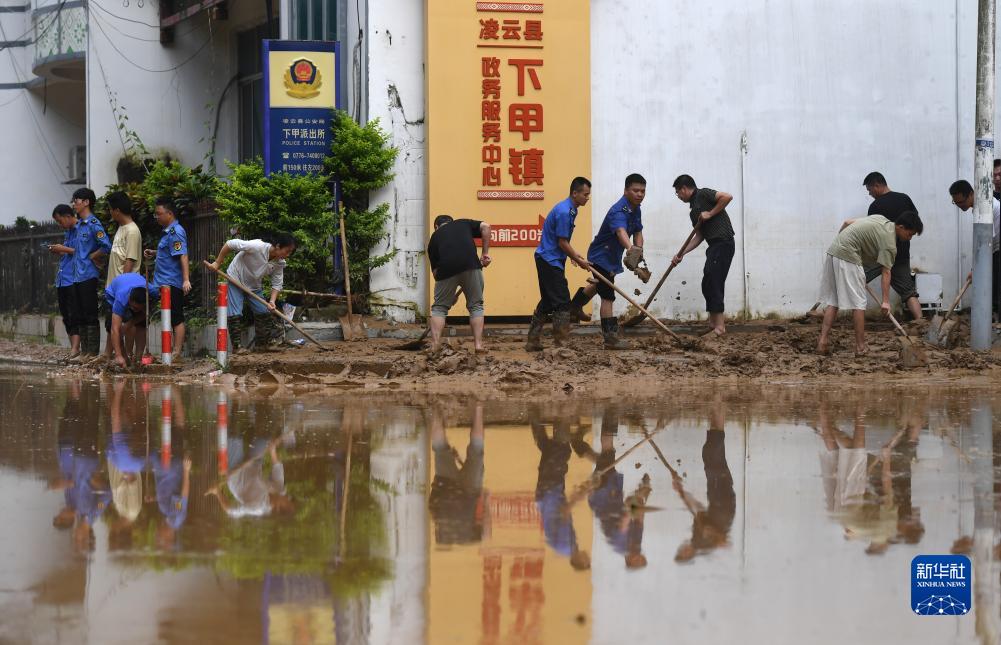 8月24日,在廣西百色市凌雲縣下甲鎮,人們在清理道路上的淤泥。