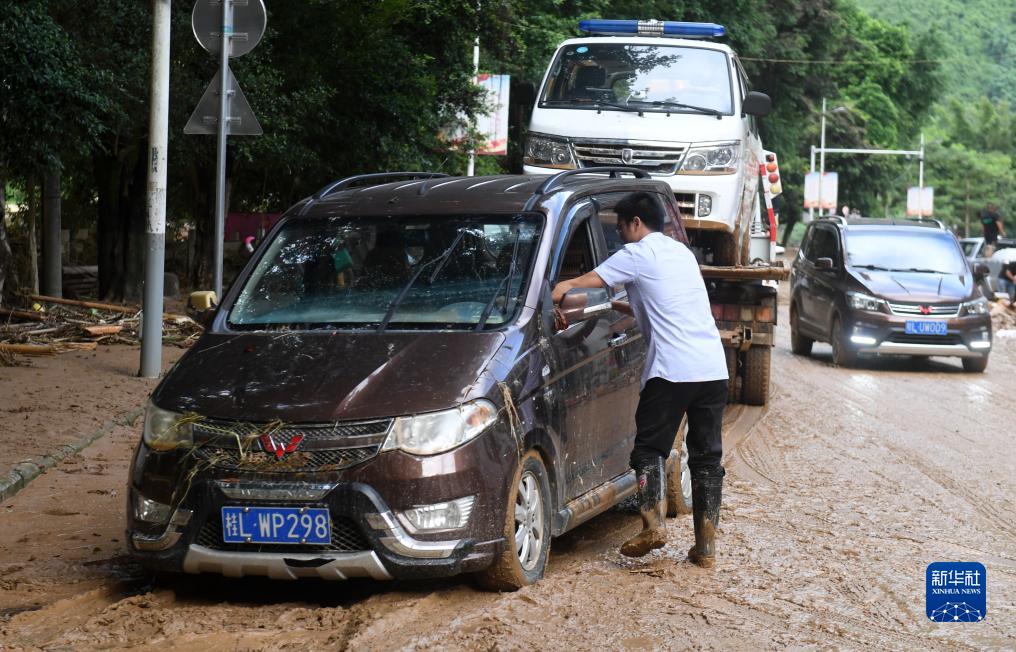 8月24日,在廣西百色市凌雲縣下甲鎮,工作人員對一輛被困汽車施救。