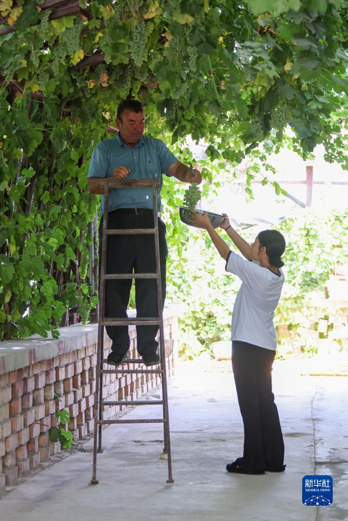8月18日,爾肯·熱衣木(左)在家中和女兒一起摘葡萄。