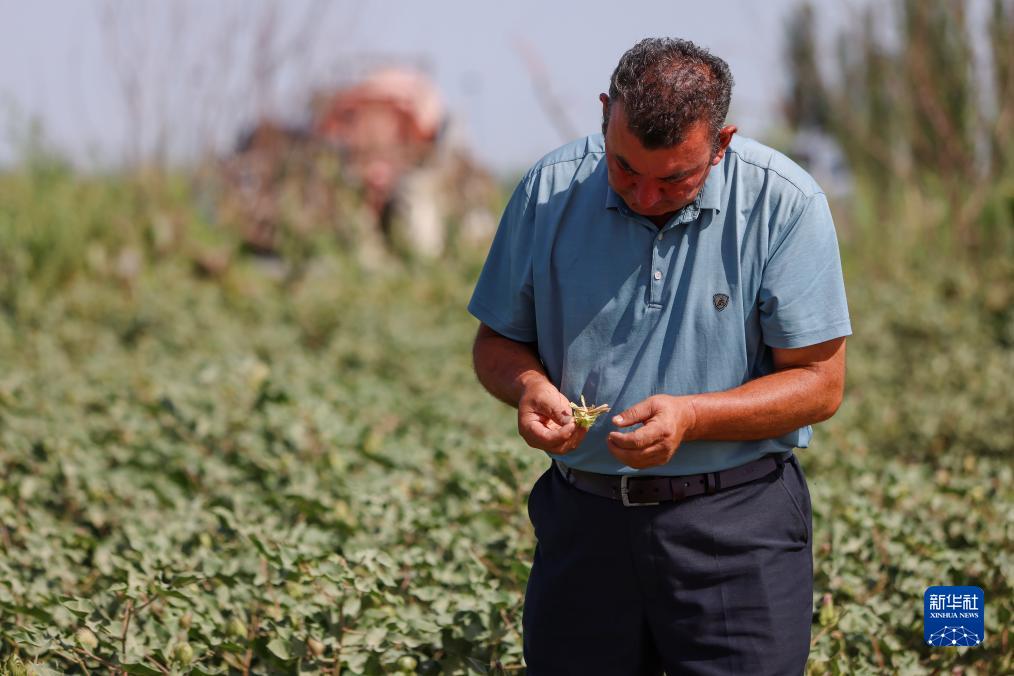 8月17日,爾肯·熱衣木撿起一株乾枯的棉桃,分析棉桃乾枯原因。