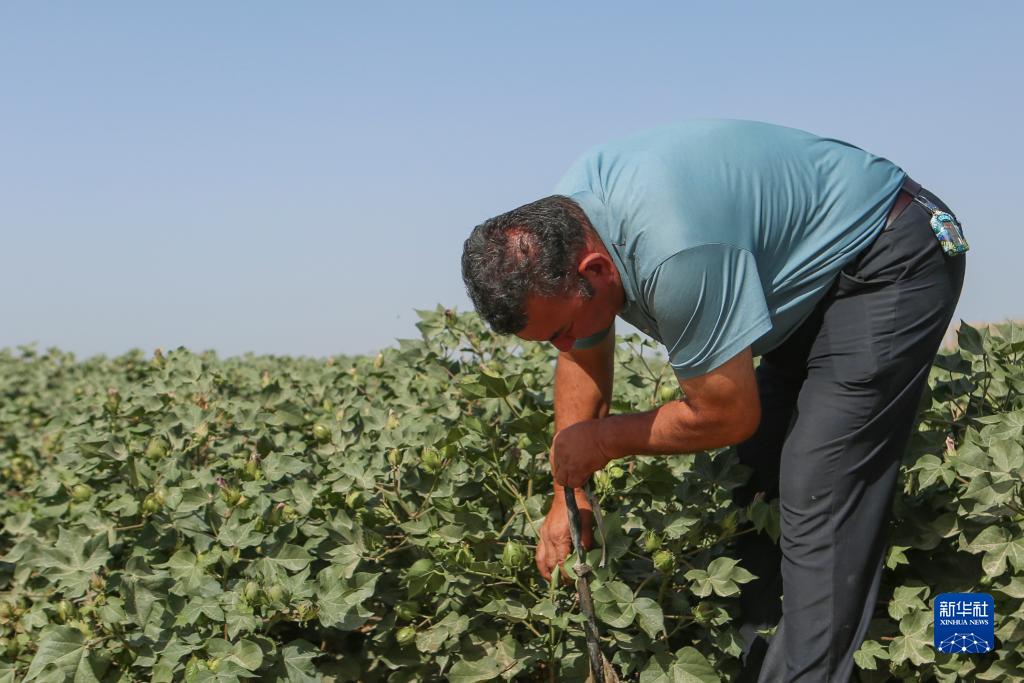 8月17日,爾肯·熱衣木檢查滴灌帶澆水情況。