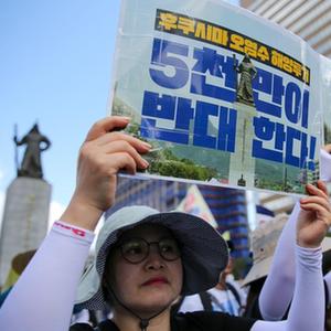 當日,韓國最大在野黨共同民主黨成員和眾多市民聚集在首爾光化門廣場,手舉標語進行示威游行,抗議日本核污染水排海。日本政府24日啟動福島核污染水排海,這一決定遭到國際社會的批評和反對。