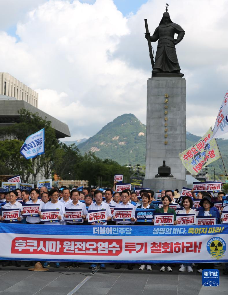 當日,韓國最大在野黨共同民主黨成員和眾多市民聚集在首爾光化門廣場,手舉標語進行示威游行,抗議日本核污染水排海。日本政府24日啟動福島核污染水排海,這一決定遭到國際社會的批評和反對。