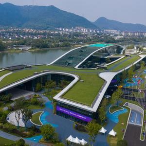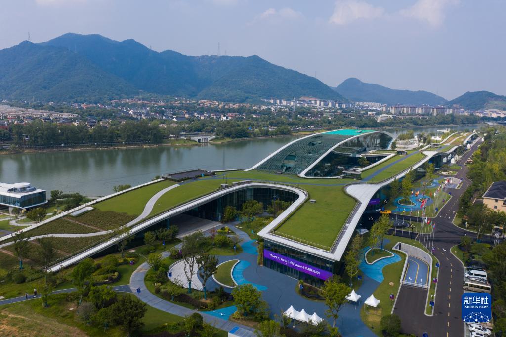 8月24日,空中俯瞰杭州富陽水上運動中心,屋頂被綠植覆蓋(無人機照片)。