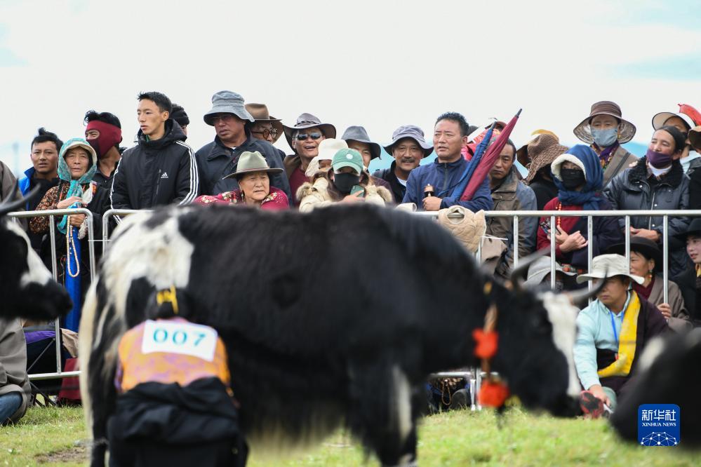 8月25日,在四川省阿壩藏族羌族自治州紅原縣雅克音樂牧場,當地群眾和游客在觀看擠牦牛奶比賽。
