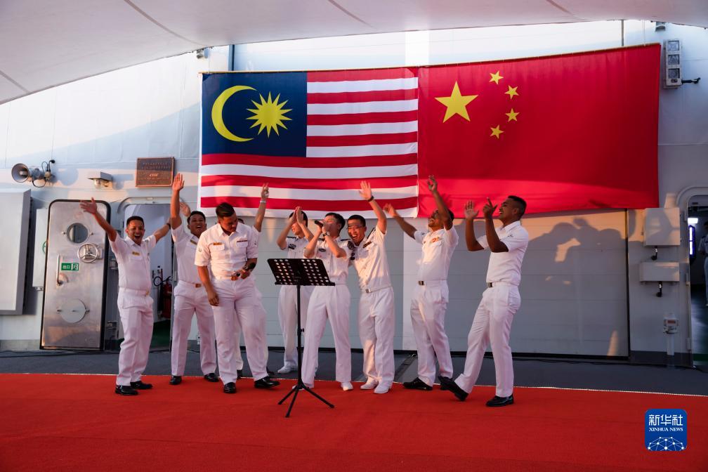 8月18日,在馬來西亞巴生,中馬官兵在南寧艦組織的甲板招待會上合唱歌曲。