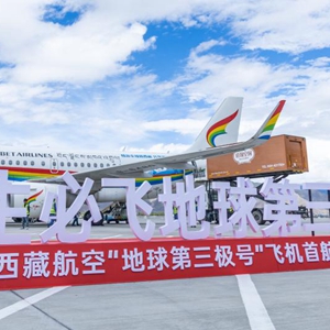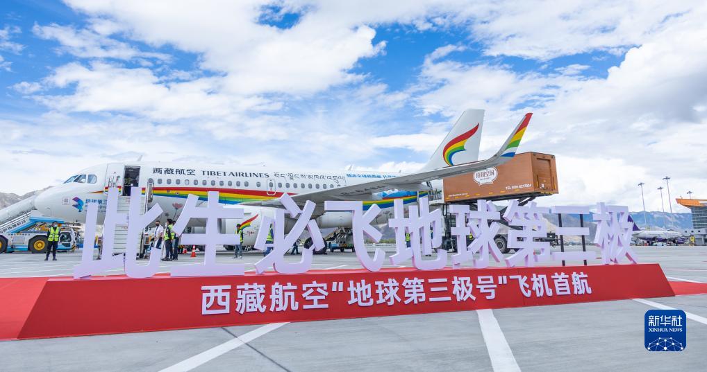 8月25日,以“地球第三極號”冠名的西藏航空TV9851次航班從成都飛抵拉薩貢嘎國際機場。此活動旨在推動西藏特色産業發展,同時吸引更多人走進西藏、發展西藏、宣傳西藏。新華社發(丁增尼達攝)