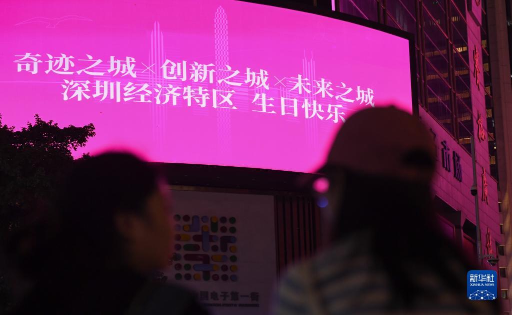 8月25日,兩位市民在深圳華強北觀看為深圳慶生的廣告牌。新華社記者 毛思倩 攝