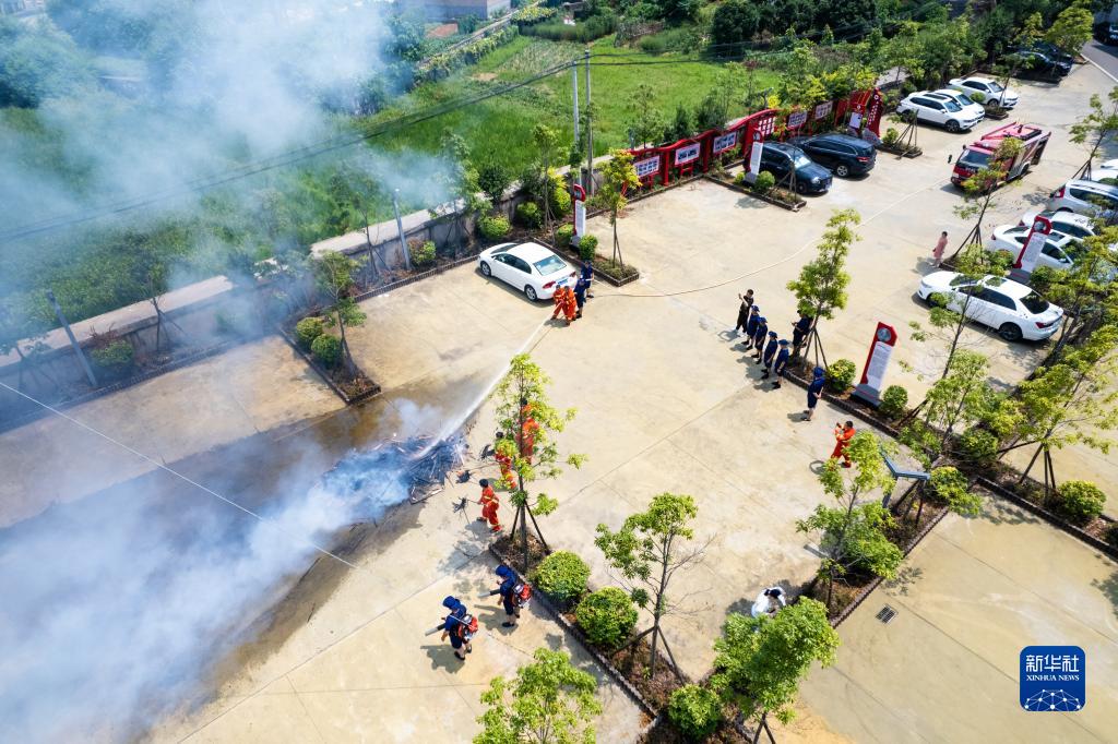8月25日,在瀏陽市金剛鎮政府院內,護林員和森林消防隊員進行消防演練(無人機照片)。