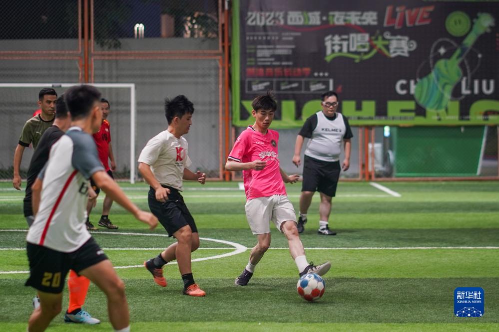 市民在南京市建鄴區西城·夜未央運動街區踢足球(8月25日攝)。