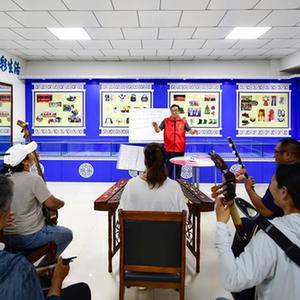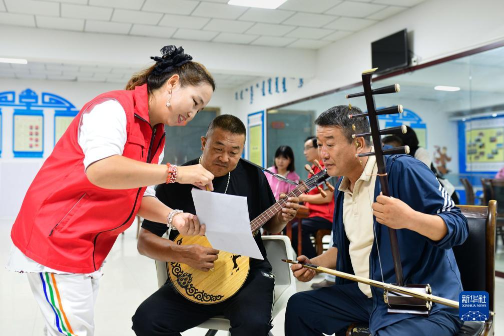 8月26日,在鄂托克前旗上海廟鎮阿勒&嘎查文化活動中心美育課堂上,志願者烏吉斯古楞(左)指導農牧民練習樂器演奏。