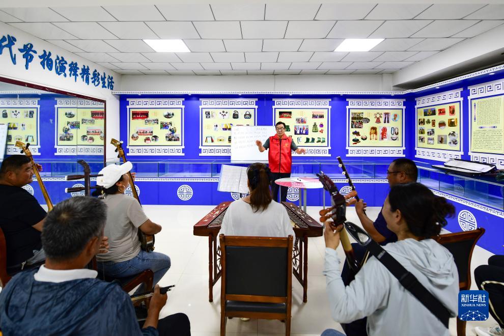 8月26日,在鄂托克前旗上海廟鎮阿勒&嘎查文化活動中心美育課堂上,志願者額爾肯吉日嘎拉指導農牧民練習演奏樂曲。